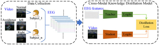 In the context of driving intention recognition, combining EEG and video modalities provides deeper insights into the driver’s cognitive state and the external environment, significantly improving the accuracy and reliability of intention recognition. By using the EEG model as the teacher and the video model as the student in a CMKD framework, this study not only addresses the limitations of traditional single-modal methods but also achieves seamless integration between the two modalities. This approach enhances driving intention recognition accuracy while reducing computational resource consumption, offering significant practical value.