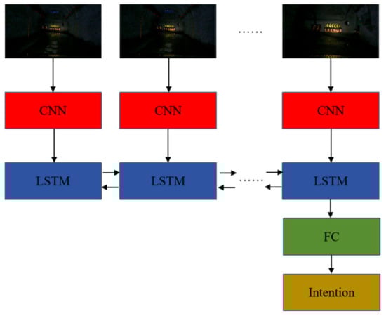 Driver intention recognition is essential for safe vehicle operation, especially in complex work environments. Accurately identifying the driver’s intentions helps make timely decisions, ensuring the vehicle operates safely and efficiently. Mine transport vehicles are indispensable for underground auxiliary transportation, playing a critical role in ensuring safety and efficiency [1]. In autonomous mine vehicle operation, accurately interpreting driver intentions is crucial for informed decision making. Drivers form intentions based on their perception of the environment and execute corresponding actions. Vehicle driving videos are key to identifying these intentions, as they capture road features, warning signs, and the behavior of other vehicles [2,3,4,5]. Machine vision-based methods for driving intention recognition are widely employed in autonomous driving systems. These approaches leverage computer vision techniques, particularly convolutional neural networks (CNNs) and other deep learning models, to analyze visual data from drivers and their environments. For instance, Xu et al. [6] proposed an end-to-end deep learning framework that predicted future vehicle actions using monocular camera images, while Ma et al. [7] introduced a weakly supervised adversarial learning approach (cGAN-LSTM) that integrated GPS-based route planners and image data for goal-oriented driving intention recognition without requiring precise localization. Davi et al. [8] utilized forward video sequences to detect turn signals and hazard lights, integrating both spatial and temporal information for action prediction. Mahdi et al. [9] presented DIPNet, a novel neural network that analyzed interior, exterior, and combined video data to forecast driver intentions seconds in advance. Despite these advancements, the unique challenges of underground mining environments hinder the effectiveness of intention recognition systems relying solely on machine vision. Poor lighting, often limited to vehicle-provided illumination [10,11], results in low-quality video images that complicate visual analysis [12,13]. Moreover, machine vision systems often fail to infer intentions such as turning, especially when images lack turning features or dynamic context. This deficiency increases the likelihood of misinterpreting driving intentions.