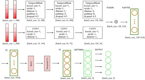 For the four-class classification of driving intentions based on EEG features stimulated by video data, the TCN_CNN model achieves the highest average classification accuracy at 67.31%. Given these findings, the TCN_CNN model, demonstrating the best performance, is selected as the teacher model for training the subsequent CMKD model. The TCN_CNN architecture diagram is shown in Figure 8.