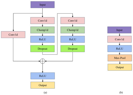 Temporal Block model and CONV model architecture diagram: (a) Temporal Block model; (b) CONV model.