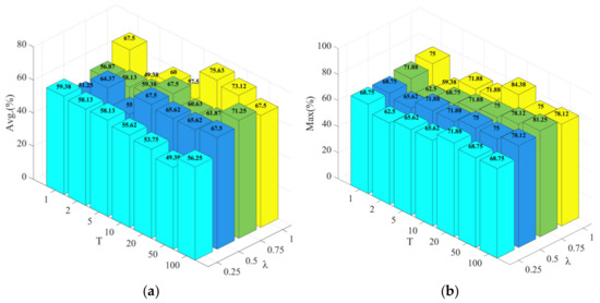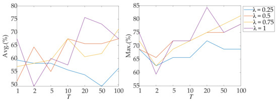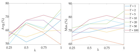 From Figure 10, it can be seen that when λ = 0.5 and λ = 0.75, the model performs better when T = 100, achieving the optimal accuracy. However, when λ = 1, the model reaches the optimal accuracy when T = 20. Similarly, from Figure 11, it can be observed that when T = 20 and λ = 1, the model achieves the best performance. Based on the above analysis, it can be concluded that when λ = 1 and T = 20, the algorithm achieves an average accuracy of 75.63% and a maximum accuracy of 84.38%. This significant performance enhancement demonstrates the effectiveness of the proposed method in recognizing driving intentions. To validate the effectiveness of the proposed method more comprehensively, we performed the Wilcoxon signed-rank test [46] on the results from the five-fold cross-validation of both methods to assess the overall significance difference between our method and LRCN_18. The results show that the proposed algorithm significantly outperforms the baseline algorithm (p = 0.0312 < 0.05), further demonstrating that our method performs significantly better than the baseline model.