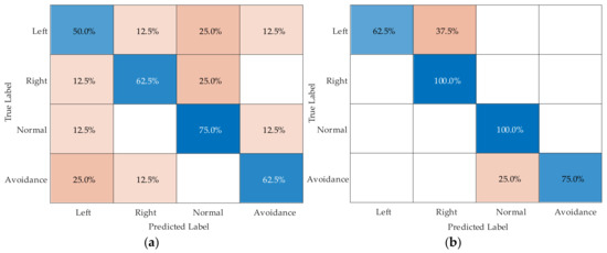 As shown in Figure 12, our method outperforms the LRCN_18 in terms of prediction accuracy for the four driving intentions. Among them, the prediction accuracies for right and normal driving intentions are the highest, with no misclassifications. It can be observed that the CMKD method significantly improves the recognition of right and normal driving intentions. However, recognizing left and avoidance driving intentions is more challenging, possibly due to confusion between these two categories, which caused misclassifications. Further optimization for these two intentions will be needed in the future. To visually assess the impact of different parameter configurations, we present bar charts comparing average and maximum accuracy across various settings in Figure 13.