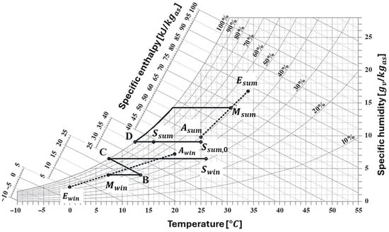 The thermal and cooling energy required for this transformation is then calculated, representing the net winter heating demand or summer cooling demand . The psychrometric transformations performed follow a pattern similar to those illustrated in Figure 2.