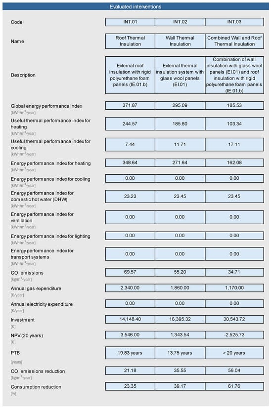 For the case study, three different retrofit interventions aimed at improving the thermal performance of the opaque envelope were selected: INT.1, INT.2, and INT.3, the latter being a combination of the first two.