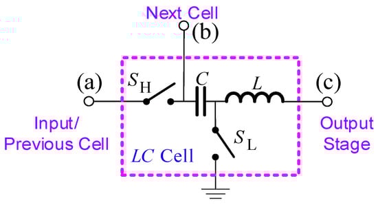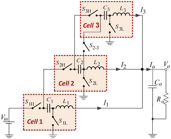 From a design perspective, many power converters can be analyzed as being constructed around a fundamental cell [10,45,46,47]. This fundamental cell enables the implementation of several different topologies, which share a mode of operation and provide various conversion ratios by reconfiguring its connection orientation. For instance, common converter topologies such as buck, boost, and buck–boost share a core structure comprising a single inductor and two switches [48,49,50]. Despite utilizing the same basic components, these converters achieve different functionalities through distinct topological arrangements.