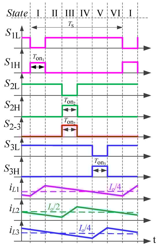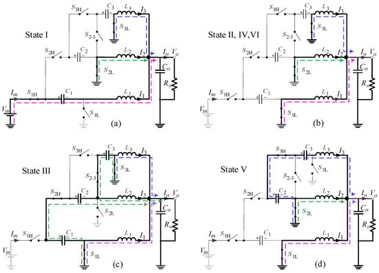 State V (Figure 4d) is the charging state for phase 3, and phases 1 and 2 are discharging. Switches S1L, S2L, and S3H are ON, and capacitor C2 charges capacitor C3 and inductor L3, while at the same time this chain C2, C3, and L3 delivers current to the load. Inductors L1 and L2 are delivering current to the load during this state.