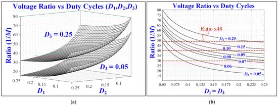 The voltage ratio (1/M) of the presented topology according to Equation (6): (a) a continuous combination of D1 and D2 ranging from 0.05 to 0.25, with two constant values of D3 (0.05 and 0.25); (b) a case where D1 = D3 and are the x axis, and black solid traces represent several D2 values. Dashed red traces represent some conversion ratios and demonstrate the flexibility of the converter to achieve the same conversion ratio with several different duty ratio options.