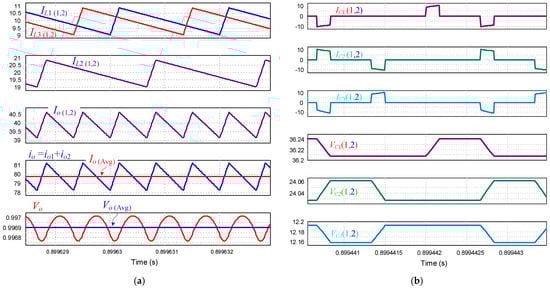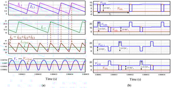 A steady-state simulation waveforms of 40 W, 48 V-to-1 V converter for an output current of 40 A with equal duty ratios of 1/12 is shown in Figure 7. The output voltage, inductors currents, and the sum of the inductor currents in the CCM mode are shown in Figure 7a. Note that due to the three-phase interleaved operation of the converter, the effective switching frequency at the output of the converter triples from 500 kHz to 1.5 MHz. From the results, natural current sharing is observed between phases and a ratio of 2:1 between IL2 to IL1 and IL3 can be seen. The simulation includes switch resistances RDS (on) as outlined in Table 3, so that the output voltage and current are slightly lower than theoretically expected. The maximum voltage stress of Vin/2 on the switches S2H, S2-3, and S3H is demonstrated in Figure 7b.