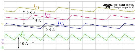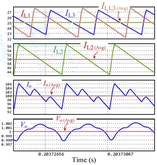 To demonstrate the current sharing robustness of the topology in a presence of inductors mismatch, a simulation of the converter operating under heavy load conditions of Vin = 48 V, Vout = 1 V, and Iout = 100 A, with equal duty ratio and different inductance values of L1 = 0.6 µH, L2 = 0.2 µH, and L3 = 0.5 µH is shown in Figure 9. The simulation demonstrates a difference between L1 and L3 on the level of a component tolerance mismatch, and a major inductance disproportion is demonstrated using a very low inductance of L2 comparing to L1 and L3. The average currents are equal to IL1 = IL3 = Iout/4 = 25 A and IL2 = 2Iout/4 = 50 A, similar to the case of equal inductances, maintaining current sharing for even the high inductance difference. The change that could be observed is in the current ripple. It should be noted that a CCM operation mode needs to be maintained to ensure current sharing and overall correct converter operation.