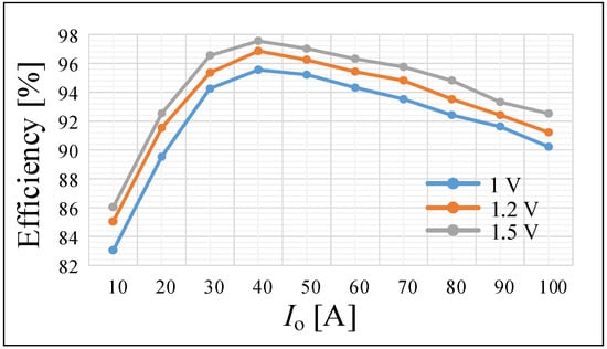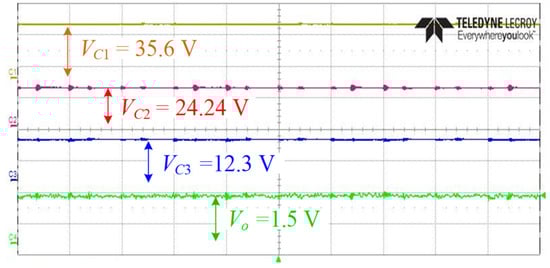 To validate the operation of the three-phase topology at a high voltage and high conversion ratio, a 100 W laboratory prototype that operates at a switching frequency of 333 kHz per phase was built and tested. Table 3 lists the components’ values and nominal parameters of the experimental prototype. Each phase in the converter has been designed to be identical, as can be seen in the photograph of the experimental prototype (Figure 10). Each cell is comprised of an inductor, a flying capacitor that consists of two 10 µF capacitors connected in parallel to reduce the ESR, and a dual N-Channel MOSFET. A microchip dsPIC33 controller is used to generate complementary gate waveforms for switches SxL and SxH. The experiments are performed with an output voltage range of 1–1.5 V and maximum load of 100 A. Figure 11 shows the three-phase inductors currents and the output current, which is the sum of all three-inductors currents, (interleaved mode), i.e., Io = 10 A and Vo = 1.5 V. We measured average capacitors voltages, and the output voltages are VC1 ≈ 36 V, VC2 ≈ 24 V, VC3 ≈ 12 V, and Vo ≈ 1.5 V, as demonstrated in Figure 12, and fully support the theoretical derivations. The existence of soft charge has been demonstrated by measuring the capacitors currents (Figure 13). Please note that the minor spikes in Figure 13 are the result of a nonideal current measurement setup. The measured voltages on all the switches are shown in Figure 14. As can be seen from the experimental results, the maximum voltage stress on switches S1L, S2L, S1H, and S3L is Vin/4 and the maximum voltage stress on switches S2H, S2-3, and S3H is Vin/2. The results align well with the theoretical analysis that is summarized in Table 1. The power stage efficiency is shown in Figure 15. Three output voltages of 1.0 V, 1.2 V, and 1.5 V are demonstrated operating off a constant input voltage of 48 V.