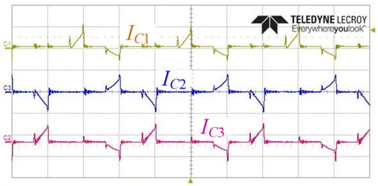 Experimental results: capacitors current measurements, C1 (yellow)—capacitor C1 current, C2 (red)—capacitor C3 current, C3 (blue)—capacitor C2 current, all channels are 12 A/div.