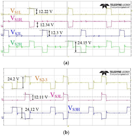 Experimental results: switches voltages, (a) C1 (yellow)—switch S1L voltage, C2 (red)—S1H voltage, C3 (blue)—S2L voltage, C4 (green)—S2H voltage, all channels are 15 V/div. (b) C1 (yellow)—switch S2-3 voltage, C2 (red)—S3L voltage, C3 (blue)—S3H voltage, all channels are 15 V/div.