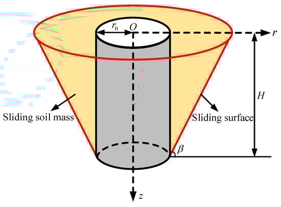 Figure 1 presents the analytical model of soil sliding behind the circular shaft wall, where the shaft has a radius r0 and a depth H. The fundamental assumptions employed in the calculations are as follows: