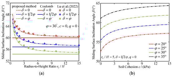 Comparison and validation of the sliding surface inclination angle and analysis of influencing factors. (a) Influence of radius-to-height ratio on the sliding surface inclination angle [21]; (b) influence of soil cohesion on the sliding surface inclination angle .
