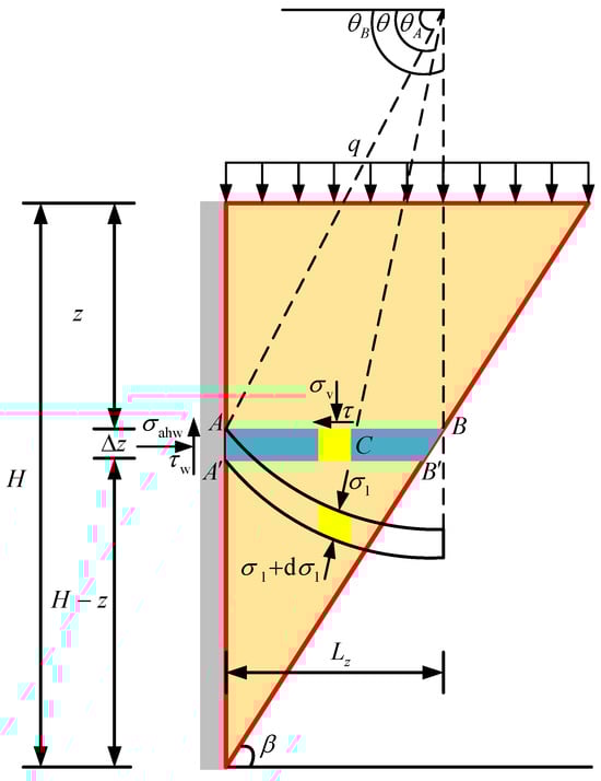 Furthermore, as shown in Figure 4, for the horizontal differential element at depth z under the active limit equilibrium state, assuming that the angle between the major principal stress direction at any point C and the horizontal plane is , the horizontal stress , vertical stress , and interlaminar shear stress at this point are given as follows: