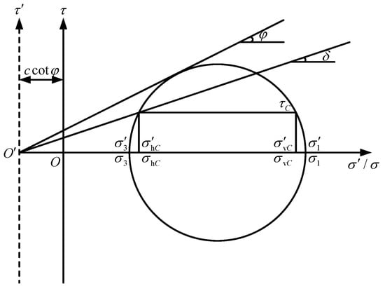 The stress Mohr circle of the soil behind the shaft wall is translated leftward by (i.e., ) units, as shown in Figure 5. The stress coordinates of any point in the equivalent coordinate system satisfy the following relationship: