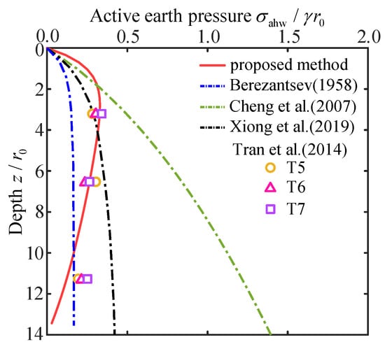 Tran et al. [34] employed a circular shaft model with a uniformly decreasing diameter to investigate the distribution of active earth pressure on the shaft wall. The relevant parameters of the model test are: . Figure 7 compares the calculation results obtained in this study with the experimental results of Tran et al. [34], and further compares and analyzes them alongside the theoretical predictions of Berezantsev [16], Cheng et al. [19], and Xiong et al. [29].