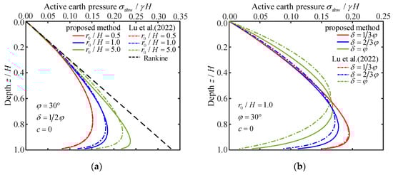 To further analyze the influence of the radius-to-height ratio and wall–soil friction angle on the distribution of active earth pressure intensity, Figure 8 presents the distribution curves of active earth pressure intensity under different radius-to-height ratios and wall–soil friction angles. Additionally, to investigate the role of the interlayer shear effect of the soil, the calculation results of this study are compared with the values reported by Lu et al. [21]. For ease of analysis, both the horizontal and vertical axes in the figure are normalized.