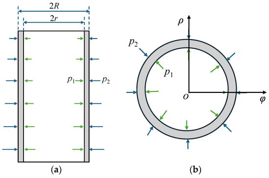 The circular shaft is shown in Figure 9a. The inner and outer diameters of the shaft support structure are denoted as r and R, respectively. It is subjected to internal pressure p1 and external pressure p2. To determine the distribution of internal forces and deformations, the following assumptions are made: