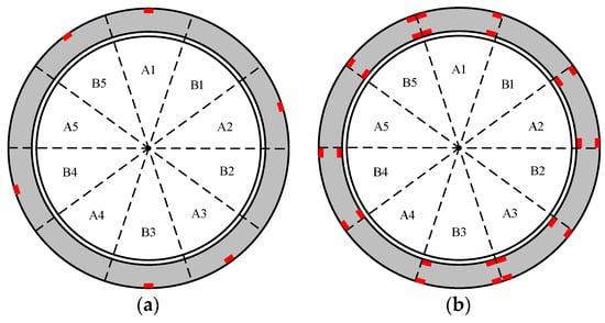 The circular shaft case study aligns well with the calculation model proposed herein, and the comparative validation based on this case is both appropriate and robust. In addition, to verify the reliability of the analytical results, vibrating wire earth pressure gauges and steel reinforcement bar axial force gauges were installed to monitor the earth pressure on the Ring 3 and Ring 6 segments, as well as the axial forces in the inner and outer reinforcement bars, respectively. The locations of the monitoring points are shown in Figure 10.