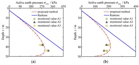 Figure 11 compares the calculated active earth pressure, the theoretical value from Rankine’s earth pressure theory, and the monitoring data from Shaft No. 2 of the Jingan Garage. As shown in the figure, the theoretical values obtained from the method proposed in this study are in good agreement with the measured results. It can serve as a theoretical basis for the optimal design of circular shaft wall structures.