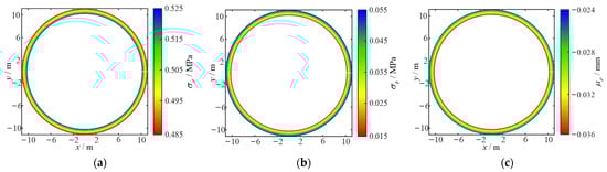 Analysis results of internal force and deformation. (a) Radial internal forces; (b) circumferential internal forces; (c) radial deformation.