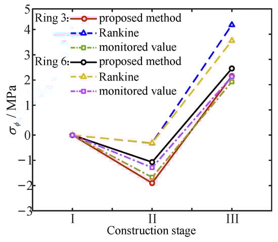where σ′φ is the circumferential internal stress; Ns1 and Ns2 are the monitored axial forces in the steel bars on the outer and inner sides of the segment, respectively; Es is the elastic modulus of the steel bars; and Ec is the elastic modulus of the reinforced concrete.