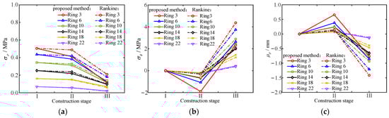 Figure 12 shows the contour plots of the analytical results for the radial internal forces, circumferential internal forces, and radial deformation of the Ring 3 segment during Stage I. As shown in the figure, the internal forces and deformations exhibited a clear symmetrical pattern, which is consistent with engineering practice.