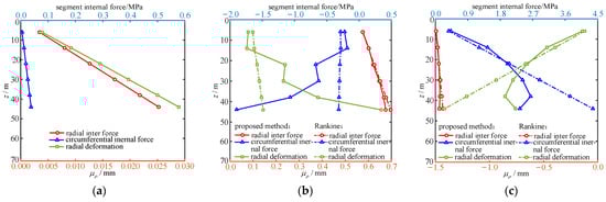 Figure 14 shows the analysis results of internal forces. As observed from Figure 13 and Figure 14, the internal forces were positively correlated with the burial depth. When the internal pressure exceeded the external pressure, the maximum radial stress occurred at the inner arc surface, while the maximum radial deformation and circumferential stress occurred at the outer arc surface. Conversely, when the external pressure was greater than the internal pressure, the pattern was reversed. A large pressure difference between the inside and outside can result in excessive forces on the segment, while excessive internal pressure may cause the segment to undergo tension. In practical engineering, it is important to avoid both large pressure differences and excessive internal pressure.