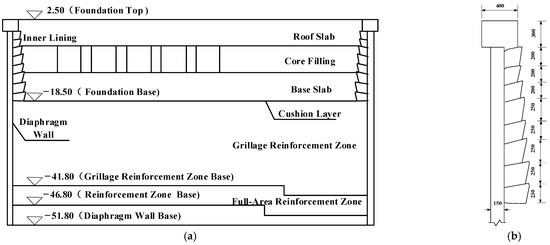 Based on geological conditions and overall anchorage design requirements, the south anchorage foundation of the northern channel bridge employs a circular diaphragm wall with an external diameter of 90 m and a wall thickness of 1.5 m, combined with an annular reinforced concrete lining support structure (see Figure 1 for the schematic diagram and Figure 2 for structural dimensions). The foundation height is 21 m, underlain by a 0.3 m thick plain concrete cushion. The excavation depth of the foundation pit is 21.3 m, with an excavation diameter of 88.5 m. The base elevation of the pit is −18.8 m, and the top elevation is +2.5 m. Below the base lies a 28 m thick artificially treated foundation, extending to an elevation of −46.8 m. The bottom elevation of the circular diaphragm wall is −51.8 m, with an embedded depth of 32 m.