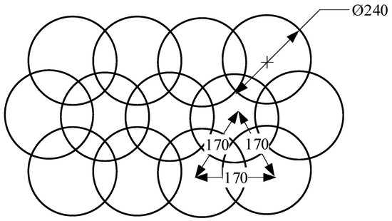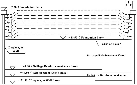 To address varying geological conditions and distinct reinforcement priorities at different depths below the base, layered and zoned reinforcement was implemented: Grid reinforcement was applied within the elevation range of −18.8 m to −44.3 m, where high-pressure jet grouting piles were arranged in a quincunx pattern with an effective pile diameter of 1.7 m, center-to-center spacing of 1.7 m, and tangent to each other; full-area reinforcement was adopted within the elevation range of −44.3 m to −49.3 m, where high-pressure jet grouting piles were also arranged in a quincunx pattern but with an effective pile diameter of 2.4 m and center-to-center spacing of 1.7 m, forming secant pile reinforcement, as shown in Figure 3 and Figure 4.