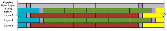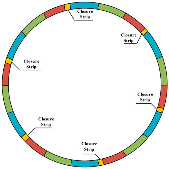The inner lining of the diaphragm wall is divided into three vertical zones from top to bottom: the first zone (0–7 m depth, 1.5 m thick, constructed in three layers of 3 m, 2 m, and 2 m), the second zone (7–14 m depth, 2.0 m thick, built in layers of 2 m, 2.5 m, and 2.5 m), and the third zone (14–21.3 m depth, 2.5 m thick, with layer heights of 2.5 m, 2.5 m, and 2.3 m). Each layer is divided into 18 planar construction units, grouped into six segments (3 units per segment), with a 2.8 m long micro-expansive concrete post-pour strip installed between adjacent segments (totaling six strips per layer, as shown in Figure 6). Vertical alignment of post-pour strips and unit joints between upper and lower layers is staggered to ensure structural integrity, as shown in Figure 7.