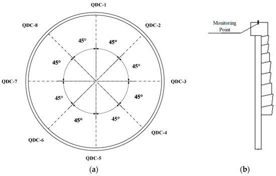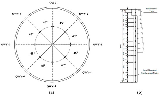 Deep horizontal displacements are measured using inclinometer tubes. Initially, 8 monitoring points (Point A series, numbered QWY-1 to QWY-8) were uniformly installed along the central axis of the diaphragm wall, embedded in the reinforcement cages of wall panels. However, due to construction errors causing inclinometer tube blockages during diaphragm wall concreting, 8 replacement displacement monitoring points (Point B series with identical numbering as Point A) were re-established 5 m outside the foundation pit perimeter. At each point, 14 omnidirectional displacement meters were installed at vertical intervals below the capping beam top: 2.25 m, 6.45 m, 9.45 m, 12.53 m, 15.98 m, 19.73 m, 23.56 m, 27.39 m, 30.62 m, 34.30 m, 39.30 m, 44.30 m, 49.30 m, and 54.30 m, as detailed in Figure 8. The omnidirectional displacement measurements were conducted using the JMQJ-1005 omnidirectional displacement meter (Jinma, Changsha, China), with a measurement accuracy of ±10 mm. This configuration maintains equivalent monitoring coverage while adapting to construction constraints through exterior relocation and multi-depth instrumentation.