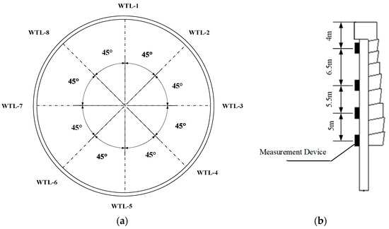 Earth pressure monitoring for the diaphragm wall is performed using earth pressure cells. The earth pressure cell employed was the VWE model vibrating wire earth pressure cell (Geonan/GEOKON, Nanjing, China). This sensor features a measurement accuracy of 0.5% FS (Full Scale) and has passed the long-term stability certification from the Geotechnical Instrument Quality Inspection and Test Center, Ministry of Water Resources (annual drift rate < 0.1% FS), making it particularly suitable for long-term automated monitoring of soil–structure interface pressures in excavation support systems. Eight monitoring points (numbered WTL-1 to WTL-8) are uniformly distributed along the central axis of the diaphragm wall and positioned on its exterior wall surface. At each monitoring point, four measurement devices are installed vertically at intervals of 4 m, 10.5 m, 16 m, and 21 m below the capping beam top, as illustrated in Figure 10.