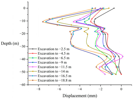Figure 11 displays the deep lateral displacement curves of a typical monitoring point QWY-7 at different excavation stages (distributed in a 270° direction). The evolution patterns of the diaphragm wall’s deep horizontal displacement during sequential excavation stages were systematically recorded by measurement devices, with the excavation stages corresponding to the sequence outlined in Table 2. In this context, positive horizontal displacement indicates outward deformation (away from the excavation pit), while negative values represent inward deformation. Since the monitoring point was not embedded within the diaphragm wall but located in the soil mass, and heavy construction machinery activity on-site significantly affected shallow lateral displacement measurements, data above −8.35 m depth were excluded. Horizontal displacement measurements at the top of the diaphragm wall were incorporated as a reference. As shown in Figure 11, the horizontal displacement at QWY-7 increased gradually during the initial excavation stages (prior to reaching −11.5 m depth) but surged significantly as excavation progressed to −16.5 m, followed by a gradual deceleration in displacement development during later stages. The displacement-depth profiles of the diaphragm wall across excavation stages exhibited consistent trends: Shallow displacements (0 m to −6.3 m) increased rapidly with depth, peaking within the −6.3 m to −10.65 m range. Below this zone, displacements attenuated sharply with depth until reaching −15.7 m, then slightly rebounded between −15.7 m and −18.25 m. From −18.25 m to −29.55 m, displacements stabilized, followed by a continued reduction until reaching a minimum at −37.8 m. Displacements then increased again from −37.8 m to −46.5 m before gradually diminishing toward zero below −46.5 m.