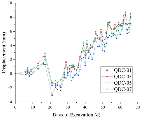 Figure 12 presents four typical monitoring points (QDC-1, QDC-3, QDC-5, and QDC-7, located at 0°, 90°, 180°, and 270° orientations), systematically documenting the evolutionary patterns of vertical displacement at the wall top throughout the entire excavation period of the foundation pit. As shown in Figure 12, during the initial excavation phase, the wall top exhibited uplift displacement, with a maximum uplift of +3 mm (at monitoring point QDC-5), attributed to soil unloading rebound caused by shallow excavation in the soft soil area. Between 17 and 21 days, the wall top began to settle, reaching a maximum settlement of approximately −3 mm (at QDC-1). Subsequently, the wall underwent multiple “increase–decrease” cycles in the vertical direction but displayed an overall upward fluctuating uplift trend. The maximum uplift of 8 mm occurred after the completion of pit excavation.