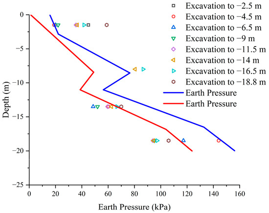 Figure 13 illustrates the earth pressure distribution at different depths of monitoring point WTL-1 along the diaphragm wall during various excavation stages, compared with the at-rest earth pressure and Rankine active earth pressure. According to Figure 13, for monitoring point WTL-1, at the −1.5 m depth, the earth pressure exceeded the at-rest earth pressure throughout all excavation stages. For the −8 m depth, the measured earth pressure values were sparse due to equipment issues but generally aligned with the at-rest earth pressure limit. However, for the −13.5 m depth, the earth pressure was approximately distributed near the active earth pressure, with some stages slightly lower than the active earth pressure. At the −18.5 m depth, the earth pressure ranged between the at-rest and active earth pressure, with some measurements slightly below the passive–active earth pressure. As excavation progressed, earth pressures at all depths initially decreased and then gradually increased. The −1.5 m depth exhibited abnormally large and irregular measurements due to soil disturbance from construction. At the −13.5 m depth, the earth pressure during initial excavation stages fell below the Rankine active earth pressure limit. When excavation reached −16.5 m, the pressure approached the Rankine active limit but showed minimal changes with further excavation. At the −18.5 m depth, the earth pressure initially aligned with the at-rest earth pressure. Upon reaching −6.5 m excavation depth, it approached the Rankine active limit, subsequently decreasing before gradually converging toward this limit with continued excavation.