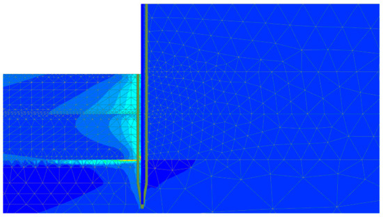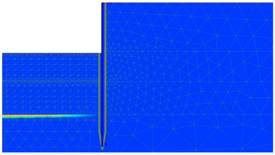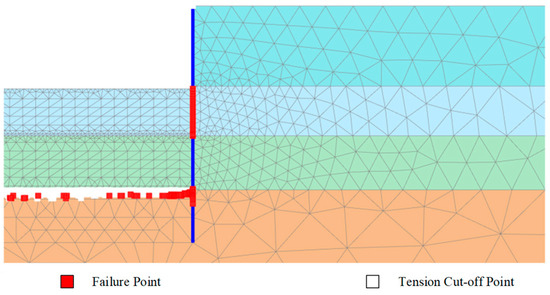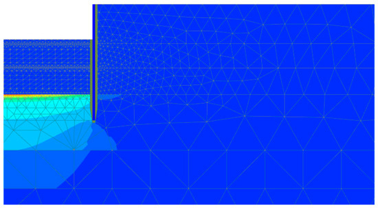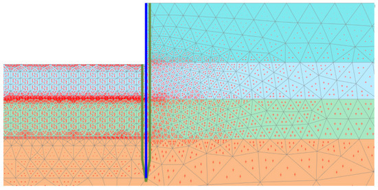 To simulate the interaction between the diaphragm wall and the soil, the parameter Rinter is used [44]. The parameter Rinter reflects the degree of interaction between the two. The default value of Rinter in the PLAXIS 2D, 0.67, was adopted [45].