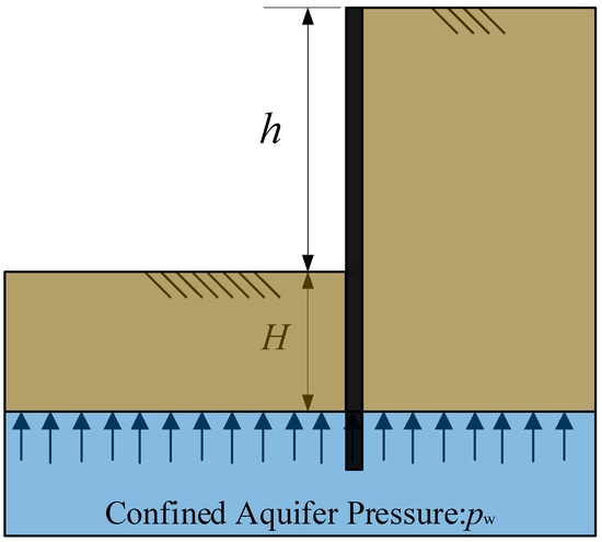 is the saturated unit weight of the soil overlying the confined aquifer (kN/m3); is the effective embedment depth of the retaining structure above the confined aquifer’s upper boundary. If the retaining structure does not penetrate into the confined aquifer, this parameter is adjusted to include the vertical distance between the retaining structure’s base and the confined aquifer’s top surface. is hydraulic pressure exerted by the confined aquifer (kPa), calculated as , where is the unit weight of water and is the piezometric head. is the critical hydraulic pressure, representing the threshold for hydraulic uplift failure instability, which is derived as .