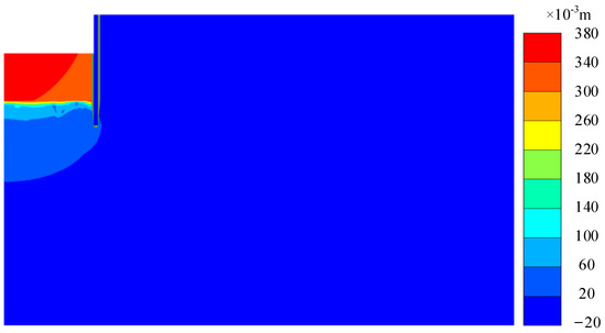 In the PLAXIS 2D (V2024), the heave deformation mechanism of the foundation pit after reinforcement was analyzed using the Strength Reduction Method for safety assessment, as illustrated in Figure 21 and Figure 22. Figure 21 shows the vertical displacement cloud map of the in-pit soil under hydraulic uplift failure. From Figure 21, it is observed that the vertical displacement is larger in the central area of the pit but smaller near the diaphragm wall interface while the foundation pit experienced base heave failure, which is same as the deformation mechanisms of the foundation pit without reinforcement. Figure 22 presents the incremental displacement cloud map of the soil under base heave failure. Figure 22 clearly reveals the heave failure mechanism and the external soil slip surface, where sliding occurs at the base of the diaphragm wall. This indicates that the failure mode is heave failure rather than hydraulic uplift failure, which significantly differs from the failure mechanism without reinforcement.