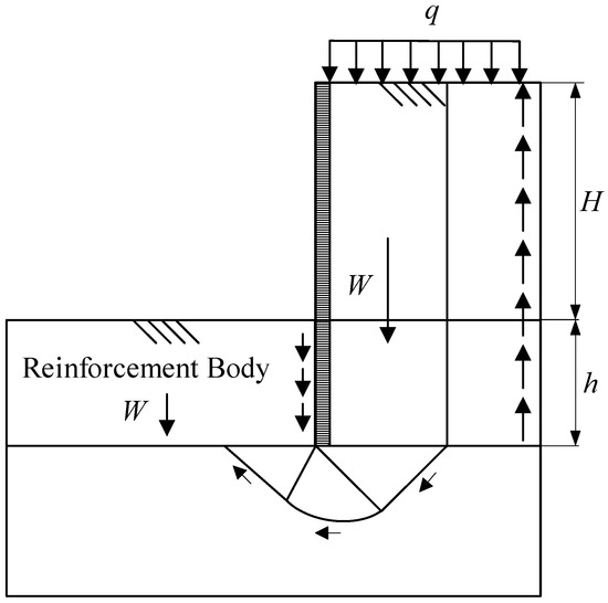 By analyzing the failure mechanisms derived from finite element simulations and based on Terzaghi’s bearing capacity model for anti-heave stability verification [31]—which considers soil weight, cohesion, and surcharge load as components of shallow foundation bearing capacity—this study proposes an improved stability against base heave verification method. The schematic diagram of this method is shown in Figure 23. The study by Yin et al. [3] demonstrated that ground improvement effectively enhances anti-heaving stability—a conclusion similarly applicable to the foundation reinforcement methodology employed in this research. Due to ground improvement, the soil layer below the pit base within the reinforced zone has been significantly strengthened. Consequently, soil sliding occurs at the base of the diaphragm wall support. Moreover, since the high-pressure rotary jet grouting reinforcement exhibits enhanced shear resistance, the calculation should emphasize the contribution against base heave generated by this reinforced zone.