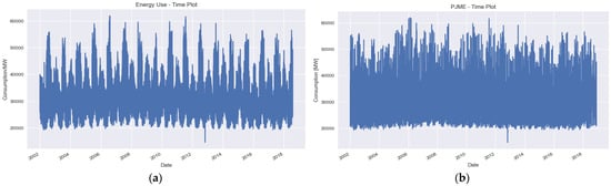 For the purpose of this article, we used hourly energy consumption data for the years 2002–2018, which is freely available on Kaggle and belongs to PJM Interconnection LLC (PJM) (Norristown, PA, USA). The datasets are hourly energy consumption data from PJM, a regional transmission organization in the United States that supplies electricity to Delaware, Illinois, Indiana, Kentucky, Maryland, Michigan, New Jersey, North Carolina, Ohio, Pennsylvania, Tennessee, Virginia, West Virginia, and the District of Columbia. We did not use the entire dataset but a part of it in our study. The data we use is the energy consumption rate of PJM East Region (PJME). PJM Interconnection LLC (PJME) provides a time series dataset consisting of 145,366 rows and 2 features. The consumption data is in megawatts (MW) [].