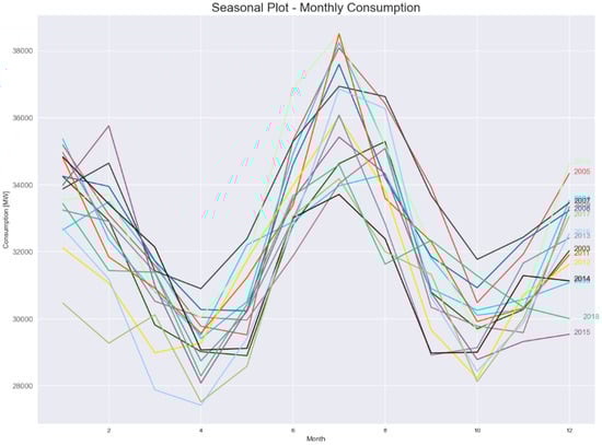 According to Figure 1b, it can be seen that all years have similar patterns. It can be observed that consumption values increase significantly in winter and summer (for heating/cooling purposes) and reach the highest levels in summer. However, in the mild spring and autumn months, consumption can be seen to be at a minimum.