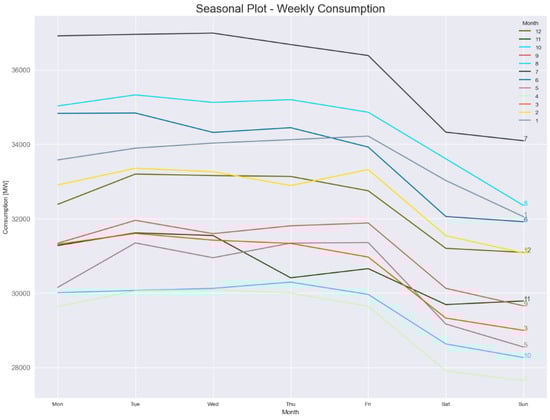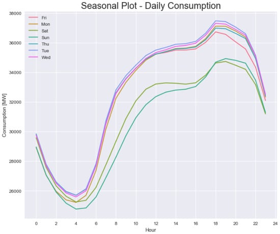 The values to be considered for time series are the time intervals that exhibit seasonal behavior and the most variability. For this reason, the values that should be taken as an example in our study are seen as the last 24 h values, because, when looking at the annual, monthly, weekly, daily, and hourly values in Figure 2, Figure 3 and Figure 4, it can be seen that the data shows similar behavior and there is no extreme difference between the values. The maximum difference is seen between intraday hourly values. However, for example, the consumption value of the previous day at 11:00 and the consumption value of the next day at 11:00 are similar. Therefore, when estimating today’s consumption, one should look at yesterday as the most similar value.