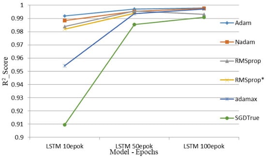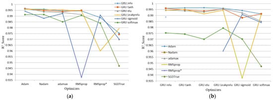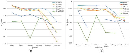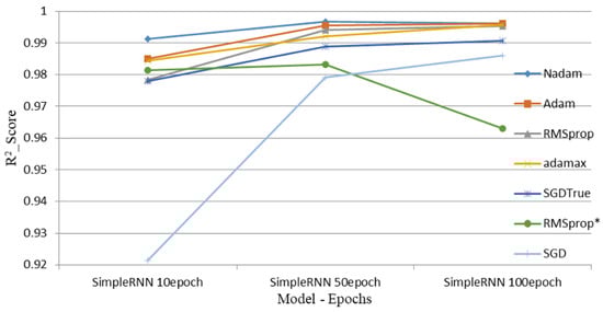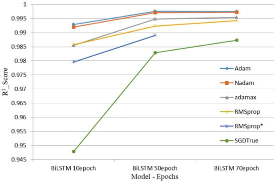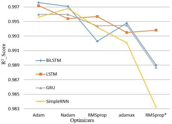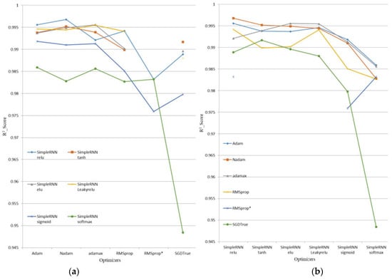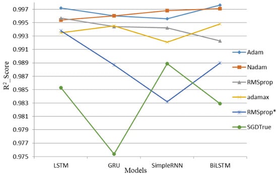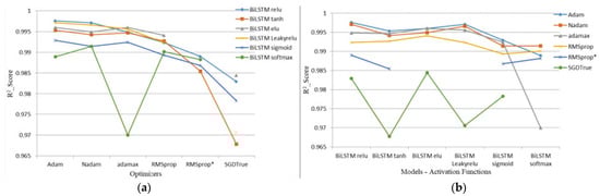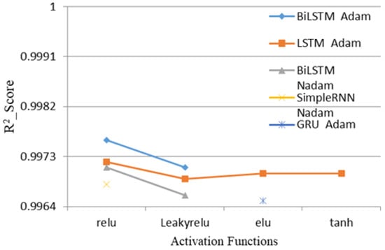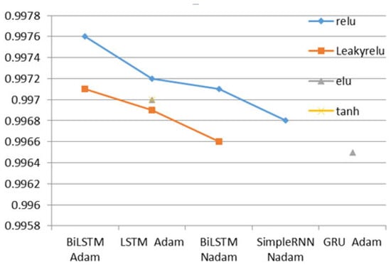 The graph of the 10 most successful models according to Table 7 according to their activation function is shown in Figure 17. Accordingly, successful models can be listed as BiLSTM–Adam, LSTM–Adam, BiLSTM–Nadam, Simple RNN–Nadam, and GRU–Adam, respectively.