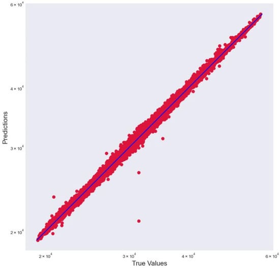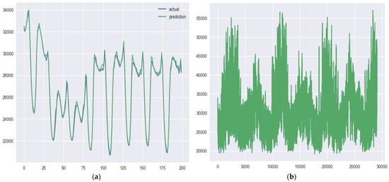 The 10 most successful studies according to MAE, RMSE, and R2_score indices are listed in Table 7. In all these experiments, the epoch value was taken as 50. The most successful study was obtained with the BiLSTM model, the ReLU activation function, and the Adam optimization function. In the study, a value of 0.9976 was reached for R2. Another study using the same dataset reached an R2 value of 0.9913, which was presented as the highest value obtained []. Another study using the same dataset reached an R2 value of 0.98 []. In a similar study, applying random hyperparameter optimisation to the LSTM model reduced the error rate to below 1.5% []. The graph of the real and predicted values of the first 200 and 30,000 values of this model can be seen in Figure 15a,b. Figure 16 shows how close the predictions are to the real value line. In other models, the success ranking decreases from the highest to the lowest.