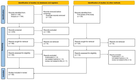 The second search returned 941 published works in WoS and 1643 in Scopus. After filtering for recency, research domain, and type of work (i.e., peer-reviewed journal papers), we end up with 95 and 154 identified works on WoS and Scopus databases, respectively. After removing duplicates and applying the elimination criteria, another 181 records were removed, leaving 68 for retrieval. Full texts could not be obtained for 9 records, resulting in 59 full-text articles.