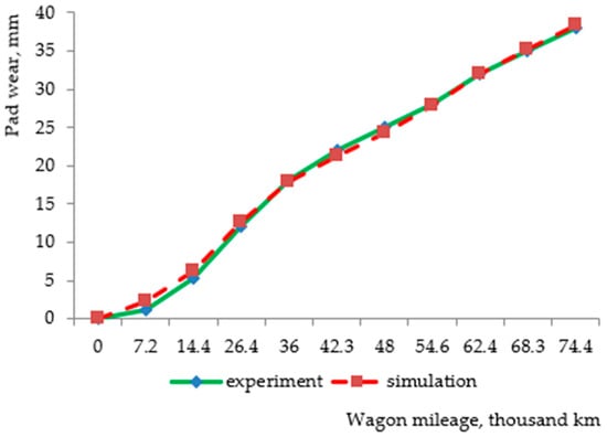 Comparison of experimental and simulated values of brake pad wear at different wagon mileages.