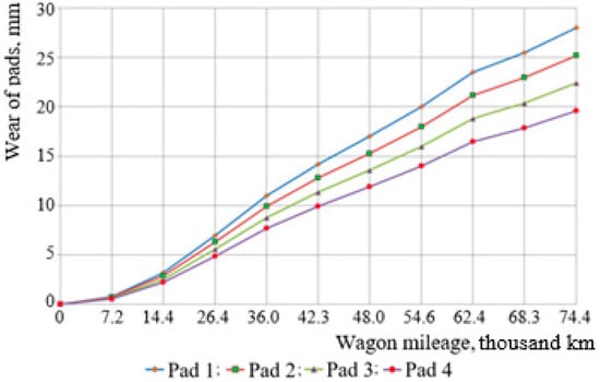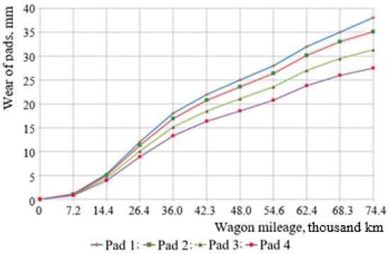 The obtained statistical data on thicknesses of composite brake pads at the control points of wagon bogies were processed. Based on the obtained data, graphical dependencies for the average wear value of the pads of wagon bogies were built (Figure 3 and Figure 4).
