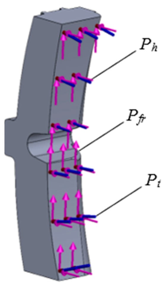 The design diagram of the wheel takes into account the following force factors: force from the pad Pp, friction force Pfr, torque M and temperature effect PT (Figure 10c). The value of the temperature effect is taken as equal to 400 °C. The model does not include the force of adhesion of the wheel to the rail [,,].